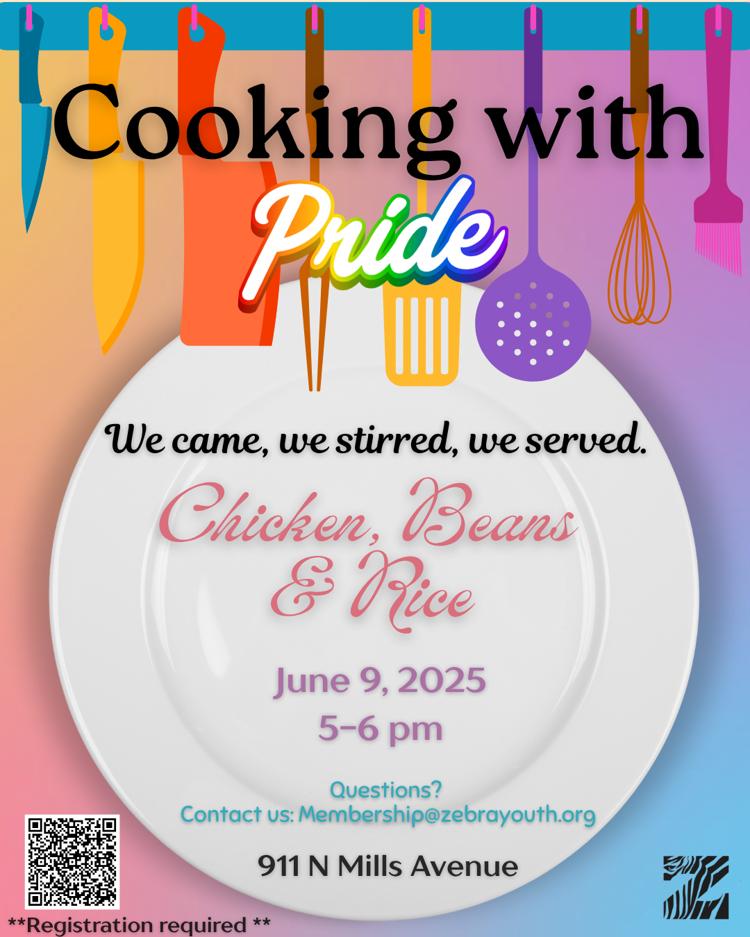 June 9 @ 5:00 pm - 6:00 pm Cooking with Pride: Chicken, Beans & Rice Zebra Youth Drop In Center 911 N Mills Ave, Orlando This event is open to current Zebra Youth members. If you are NOT a Zebra Youth member, please reach out to membership@zebrayouth.org as soon as possible to get set up…